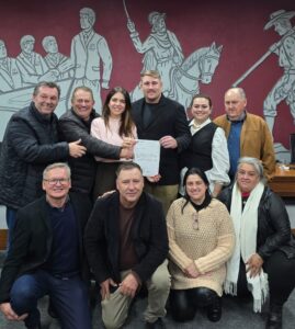 O prefeito municipal Valmor José Tomelero (MDB), o vereador Diegão (CIDADANIA), a chefe de gabinete Daniela Morais, a secretária de Assistência Social Valquíria Polli, membros do