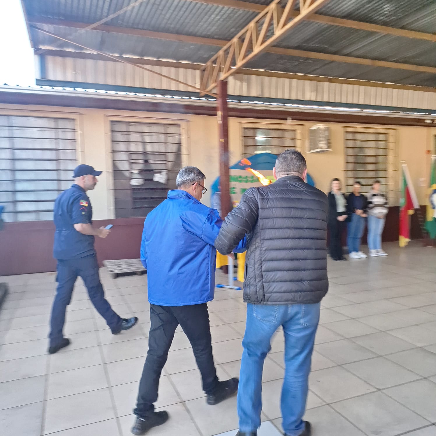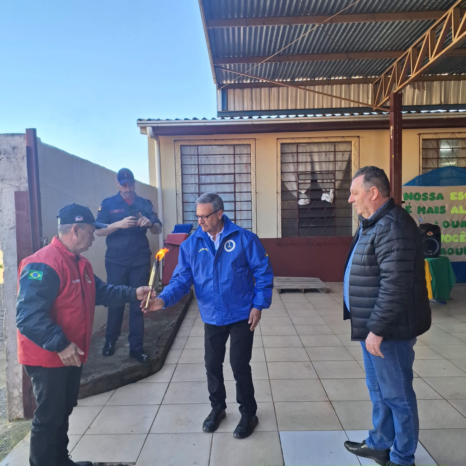 A centelha do fogo simbólico foi conduzida por figuras de grande representatividade: o Comandante do Eixo Centro Norte Paulo Ricardo Pereira, integrante da Liga da Defesa Nacional e da Associação dos Lendários do 3º Regimento de Cavalaria de Guardas de Porto Alegre; o adjunto Vlamir Fraga Araújo, também membro da Associação dos Lendários; e Maiki Gustavo Santin Leão, do Corpo de Bombeiros Militar do RS (CBMRS). A presença dessas autoridades reforçou o compromisso com a preservação da memória nacional e o fortalecimento dos valores patrióticos.
