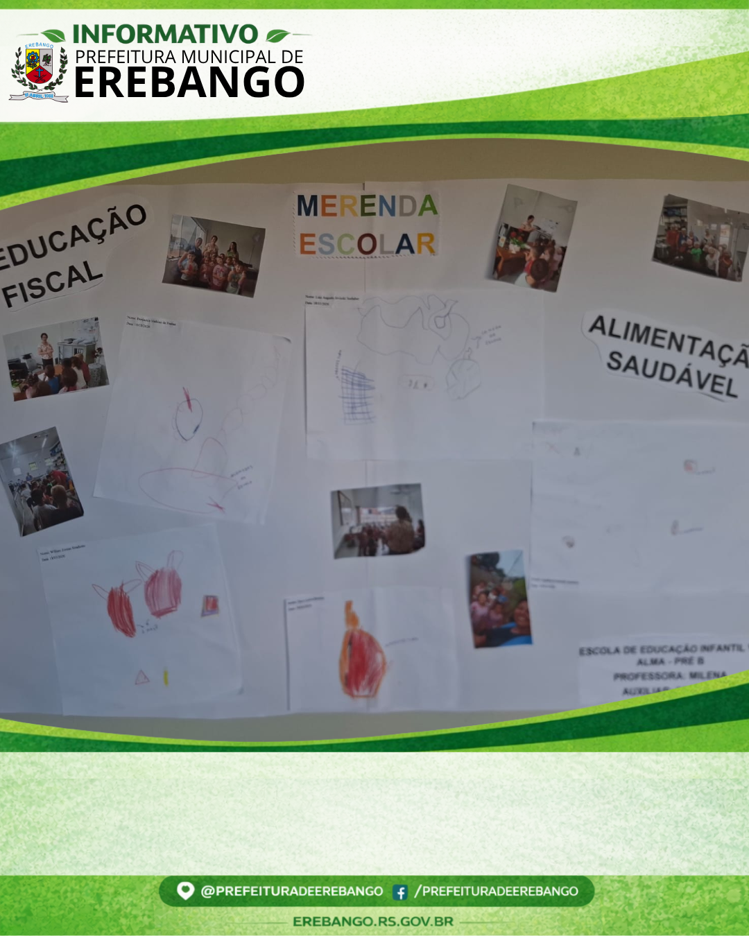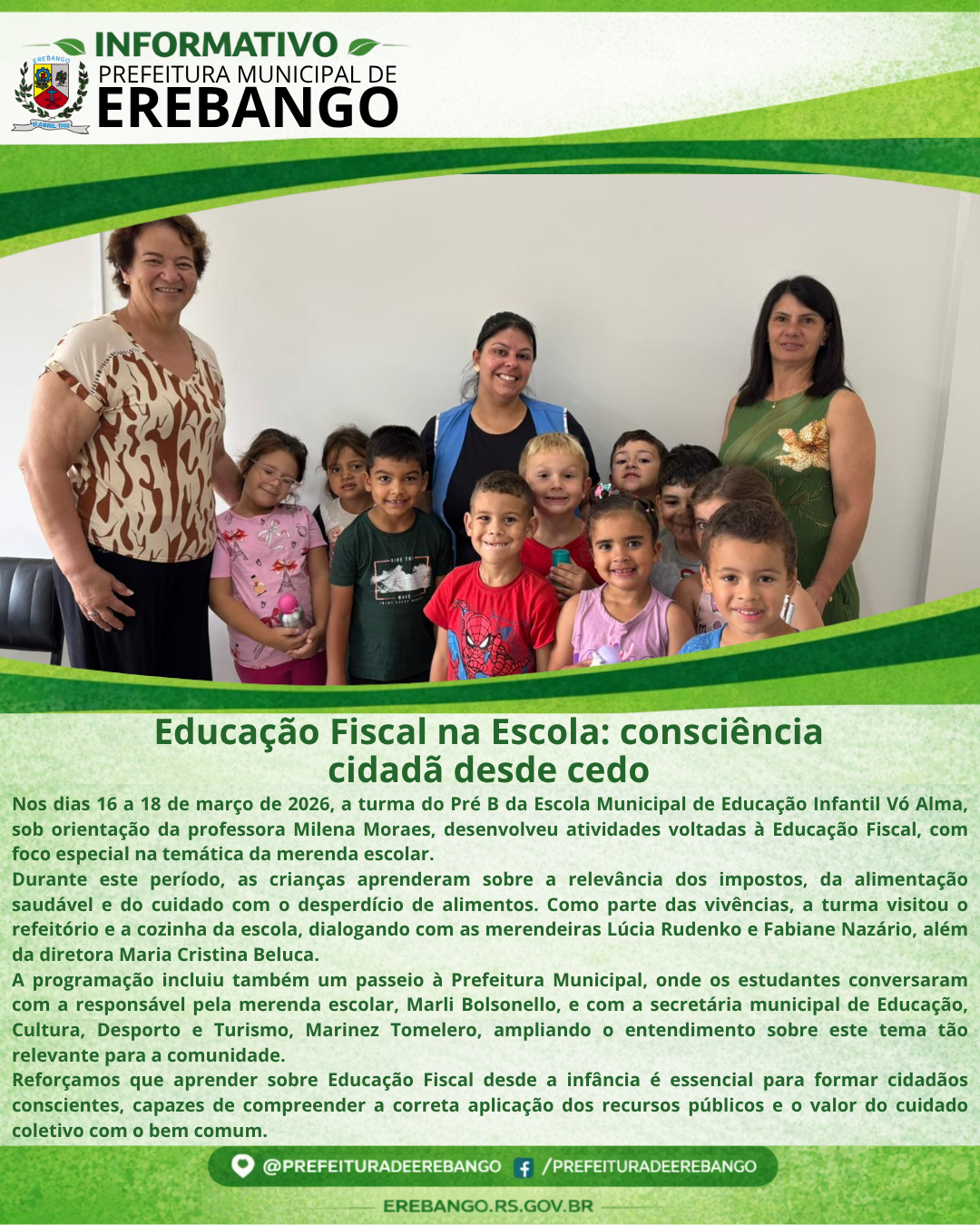 Nos dias 16 a 18 de março de 2026, a turma do Pré B da Escola Municipal de Educação Infantil Vó Alma, sob orientação da professora Milena Moraes, desenvolveu atividades voltadas à Educação Fiscal, com foco especial na temática da merenda escolar.