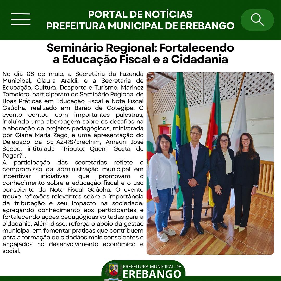 No dia 08 de maio, a Secretária Municipal de Finanças, Claura Araldi, e a Secretária de Educação, Cultura, Desporto e Turismo, Marinez Tomelero, participaram do Seminário Regional de Boas Práticas em Educação Fiscal e Nota Fiscal Gaúcha, realizado em Barão de Cotegipe. O evento contou com importantes palestras, incluindo uma abordagem sobre os desafios na elaboração de projetos pedagógicos, ministrada por Giane Maria Zago, e uma apresentação do Delegado da SEFAZ-RS/Erechim, Amauri José Secco, intitulada “Tributo: Quem Gosta de Pagar?”.